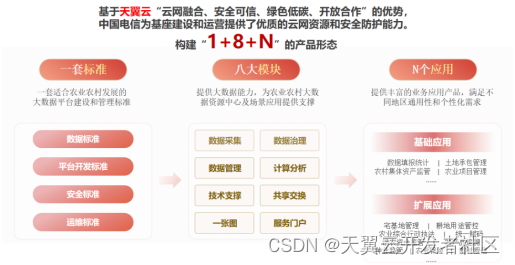在农业农村部大数据发展中心的指导下,中国电信依托在上海、天津、湖北、山西等多个省市农业农村大数据平台的成功建设经验,全程深度参与平台基座的产品设计、功能研发、标准研制、应用推广等多项核心工作。同时,基于 “云网融合、安全可信、绿色低碳、开放合作”的优势,天翼云为基座建设和运营提供了优质的云网资源和安全防护能力。