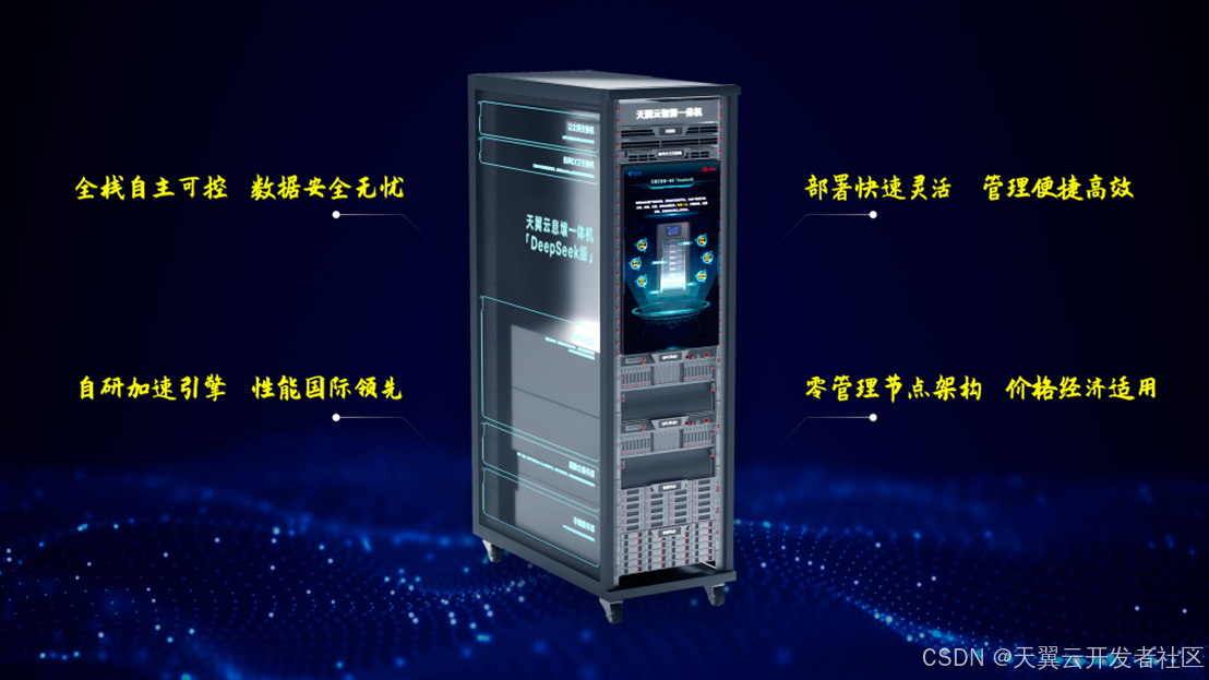 面对国产大模型DeepSeek应用热潮,天翼云从客户需求出发,推出集国产算力、国产模型和国产云服务于一身的息壤智算一体机-DeepSeek版,加速AI应用普惠。息壤智算一体机-DeepSeek版深度融合了DeepSeek-R1/V3系列大模型,实现了从芯片、推理引擎到模型服务的全栈国产化,不仅确保了技术链路的自主可控,更为企业智能转型插上了坚实翅膀。