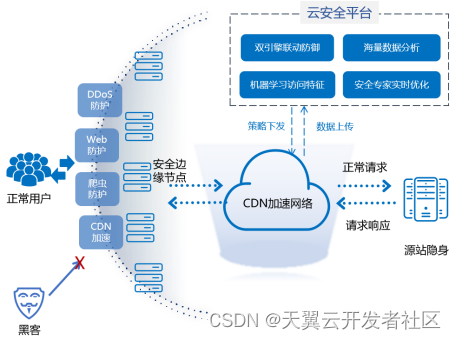 天翼云基于企业数字化转型中面临的多云环境安全问题,利用CDN的海量资源屏障,依托边缘云安全底座,建设边缘云WAF平台强大的Web安全保护能力,整合爬虫防护能力,能有效缓解恶意请求流量,识别“黄牛党”薅羊毛行为,另外叠加API安全网关能力,针对API的调用进行异常行为检测,同时具备应用层DDoS防护的能力,高性能抵御超大规模并发攻击,结合边缘安全接入平台,提供3层、4层、7层的安全接入,对所有请求进行检测和鉴权,构建边缘云安全防护防线,全面保护企业Web服务及API的业务不受攻击影响。