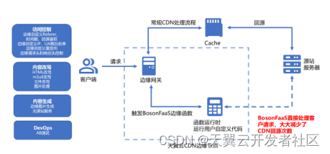 可编程CDN场景:BosonFaaS结合天翼云专业、稳定的CDN服务,实现边缘可编程CDN。主要包括静态网站动态化、边缘内容改写、自定义SEO优化、边缘ESI、边缘请求签名、边缘自定义防盗链鉴权、AB测试,可高效定制用户个性化需求,减轻源站压力,加速服务上线流程。