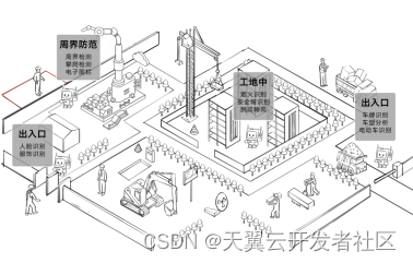 智慧工地中通常配备了大量的摄像头,iBox的部署为摄像头配置了智能AI算法。摄像头1安装在出入口负责检测人脸和服务合规;摄像头2安装在工地周界,负责检测爬高、非法入侵;摄像头3安装在工地中,负责烟火识别、脱岗睡岗、安全帽识别…… 而摄像头采集的视频流可实时上传给iBox。
