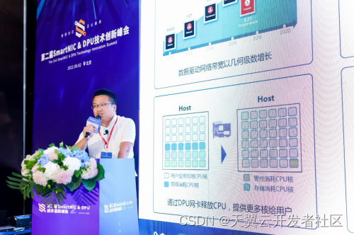 在SmartNIC&DPU技术分会场,天翼云科技有限公司资深研发专家刘禄仁分享了天翼云DPU技术的研发与实践经验。他表示,天翼云作为国内领先的云服务商,基于当前DPU技术演进路线,结合需求的零散化、动态变化以及对DPU产品线上运维问题的考量,以FPGA+CPU的架构作为切入点,成功研发出天翼云DPU1.0产品,并以自研DPU云核为基础打造了为云而生的全新云计算体系结构。