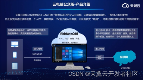 天翼云电脑公众版面向个人和家庭,支持多终端适配,无需复杂配置和装机,一键接入即可使用。用户可通过移动设备、个人PC、家庭电视等接入,利用Wi-Fi、移动网络、有线网络访问,让设备秒变电脑。