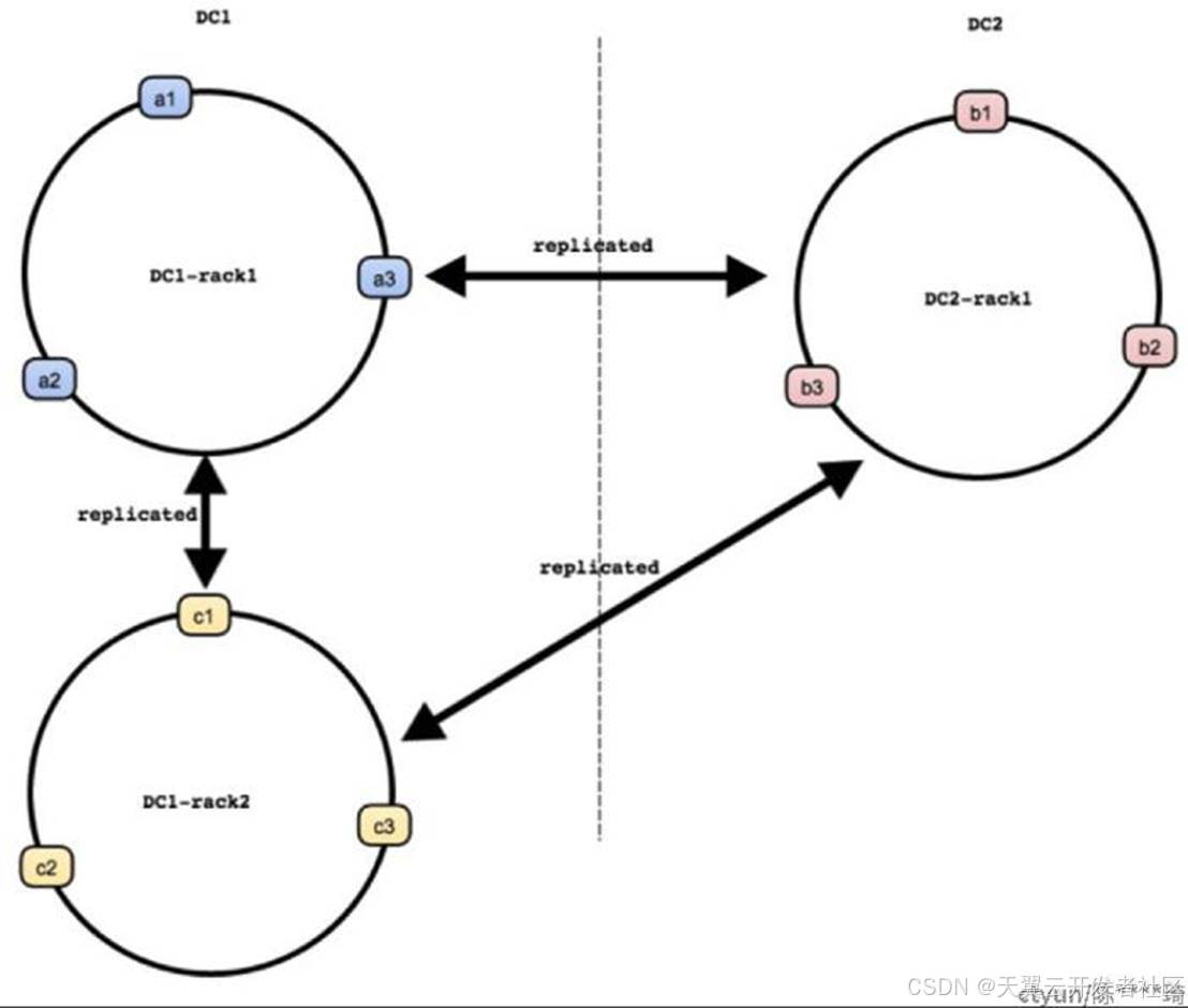 上面是官方给的两个拓扑图,其结构和elasticsearch集群的结构比较相似。 这个图里面有两个概念,datacent和rack。这两个概念举例来理解,假设我们在阿里云有集群,在腾讯云也有集群,这就叫两个datacent,或者换种说法,假设有很多集群,这些集群可以根据物理机所在位置或者其他标准,分成了两大部分,这就叫两个datacent。 然后在每个datacent内,可能某些物理机在一个机房或者机架甚至就是一个机器上的几个虚拟机,那么这些机器之间的通信等速度肯定会更快,这些机器可以组成一个集群,就叫一个rack。