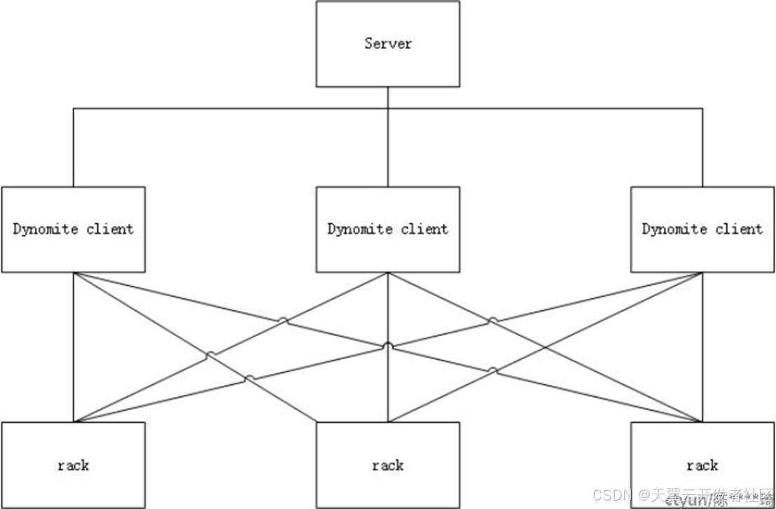 对应的服务调用方连接多个dynomite client,每个dynomite client连接多个rack,这样server在调用任意一个dynomite client时即可查询对应数据,当某个client异常无法服务时,server调用其他client。由于每个rack直接数据互相备份。所以当某个rack发生异常时,则dynomite client则使用其他rack。从而保证只要有一个dynomite client和一个rack存在时,业务即可正常使用。