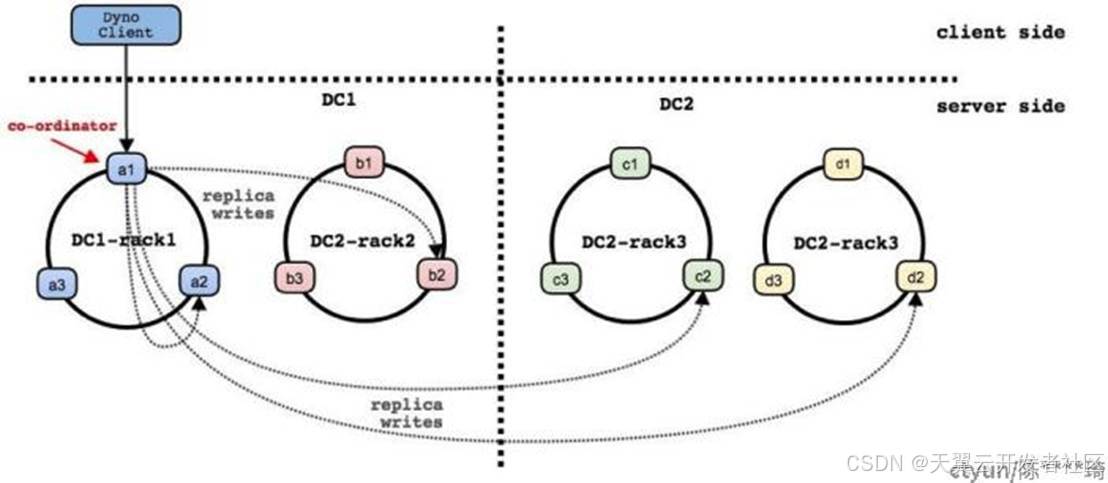 在dynomite拓扑结构中,每个rack都是一个完整集群,每个rack的都拥有完整的数据,多个rack间相互备份,这就达到了高可用,具体同步机制后面讲。
