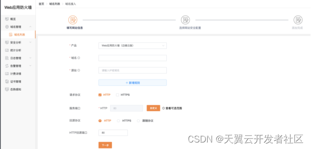 第三步,根据您的需求,填写完域名的源站信息、请求协议、服务端口、回源协议和回源端口等信息,点击【下一步】填写域名安全配置页面;