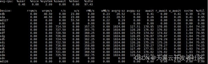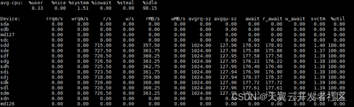 在Linux中最常用的就是iostat。它能够监控系统磁盘设备的负载,提供磁盘设备的IO合并次数,读写带宽、平均IO大小,平均队列长度,磁盘利用率等信息。
