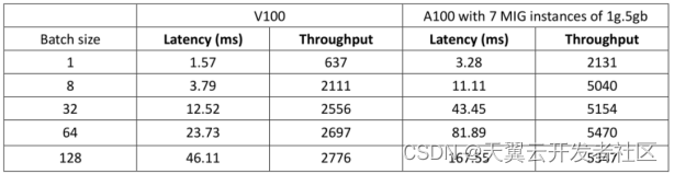表三比较了上一代旗舰产品V100与A100使用7个MIG GPU实例在FasterTransformer模型中不同batch size下的吞吐量与时延。我们可以看到在batch size为8的时候,A100的吞吐量已经很接近峰值,距离峰值不到百分之十;另一方面,V100在batch size 为8的时候,吞吐量距离峰值还有百分之三十左右,在batch size 为32时,吞吐量距离峰值也还有百分之十左右。这代表和上一代的GPU相比,MIG在提升GPU的使用率上有很大的进步。