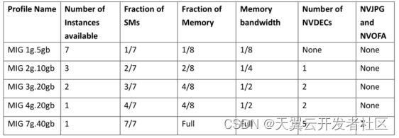 例如,用户可以创建两个MIG实例,每个实例的内存为20gb,三个实例的内存为10gb,七个实例的内存为5gb。用户创建适合其工作负载的组合。