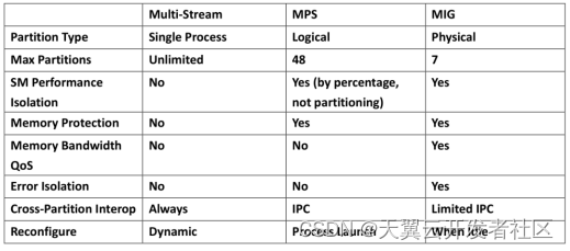 在表格 1当中,我们比较了多流 (multi-stream)、MPS 以及 MIG 的优缺点。其中,多流的使用限制较少,同时也很灵活,但对代码更动的需求大,并且无法避免使用者之间的互相干扰,使用者必须小心的使用以避免产生错误。MPS 则不需要更动代码即可使用,可以同时执行的程序也较 MIG 多 (48 与 7),内存的使用与分配也是自动处理的,不需要人工的介入。缺点在于,无法避免多个用户对于 GPU 资源的竞争;最后,MIG 虽然可以同时执行的程序数量最少,但和 MPS 一样不需要使用者另外更动代码,同时在安全性与可靠性上面也是三者中最佳的。这三样技术并不互相冲突,使用者可以根据使用的情境与场景选择与搭配使用。