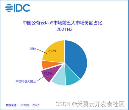 天翼云公有云业务发展势头强劲,高于平均市场增速,天翼云2021年下半年在中国公有云市场份额占比达10.3%,比2020年下半年增加1.5%,位列第四,在公有云IaaS市场第一梯队中市场份额增速最快。