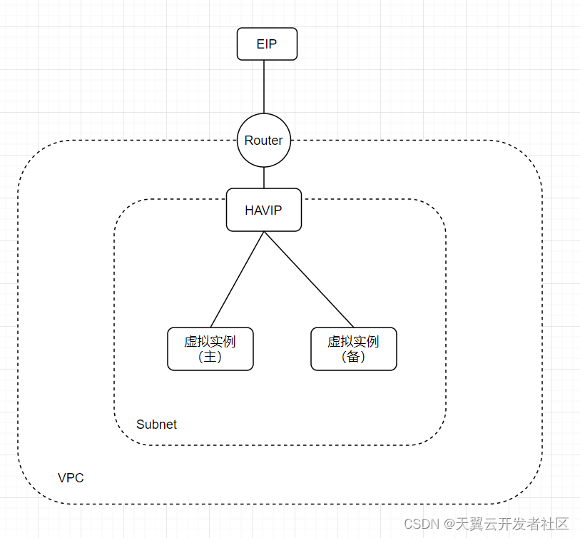 天翼云高可用虚拟IP(High-Availability Virtual IP Address,简称HAVIP)是一种可用独立创建和删除的私有网络IP地址资源。通过在VIP CIDR中申请一个私有网络IP地址,然后与高可用软件(如高可用软件Keepalived)配合使用,可用在VPC中搭建高可用的主备集群服务,提高VPC中服务的可用性。