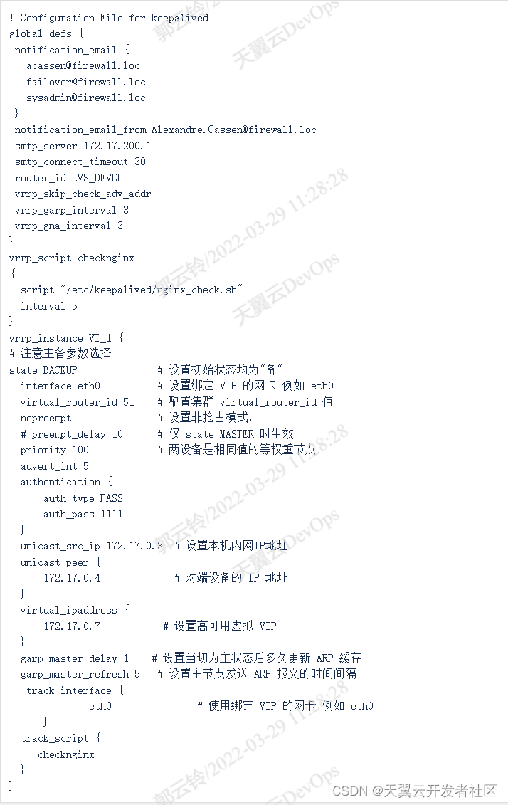 在虚拟实例VM1和VM2中分别部署高可用软件Keepalived和应用服务,修改其配置文件,启动应用服务和Keepalived。Keepalived的配置文件默认在/etc/keepalived/keepalived.conf 文件中,配置值可根据实际情况进行配置。以下配置文件为本文档进行测试时的配置: