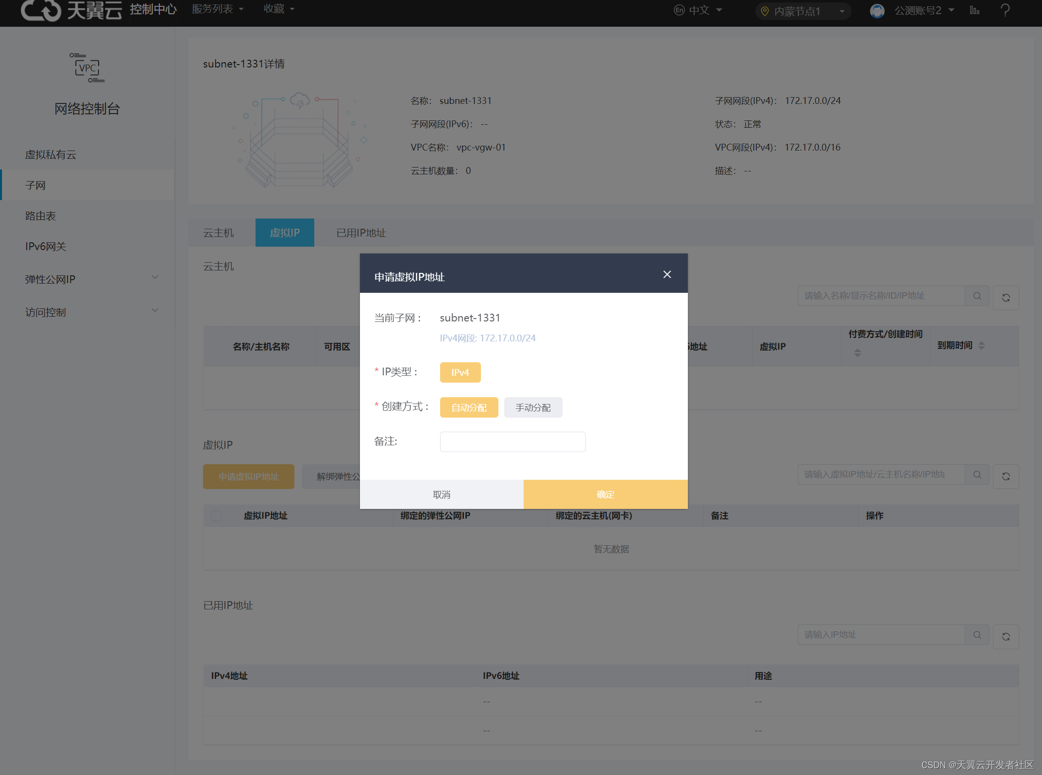进入虚拟私有云界面,选择子网,然后选择要创建虚拟IP地址的子网,在子网详情页面中创建虚拟IP地址。虚拟IP地址支持自动分配和手动指定。创建界面如下:
