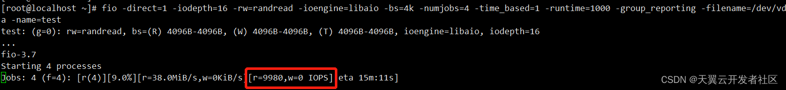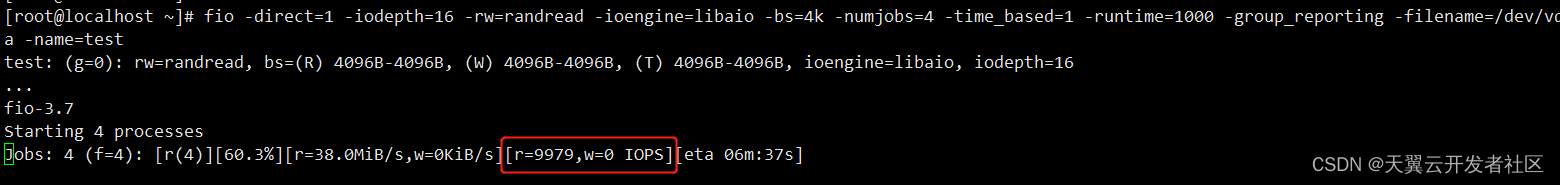 然后看一下虚拟机的性能,可以看到IOPS已经下降到1W以下,此时带宽为38M。IOPS qos限制正确生效。