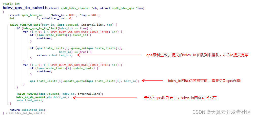 当多种qos同时配置时,qos生效策略为都通过才算qos通过,其中任何一种qos要求不满足,就排队不向驱动提交。bdev_io向驱动提交前,和bdev_io从驱动返回后,每种配置的qos均需要更改quota配额。qos生效策略可见下图bdev_qos_io_submit函数。