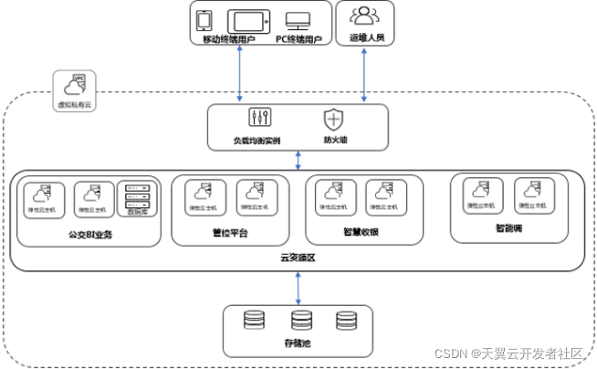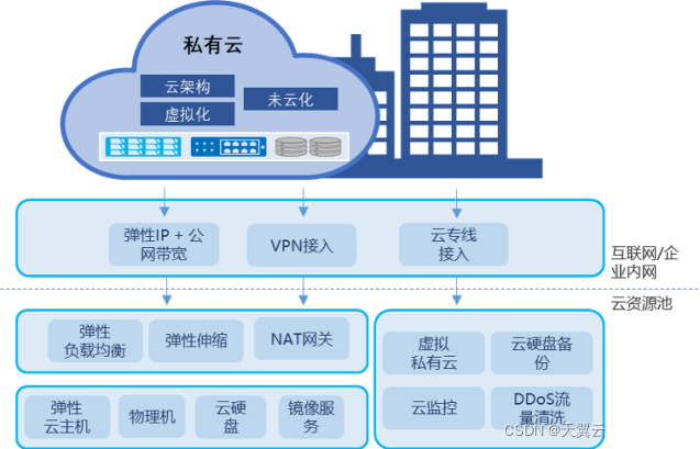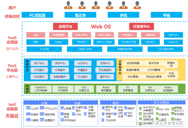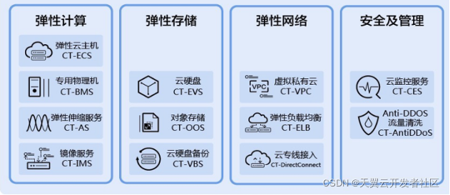 基础设施层是天翼云的基础资源,涉及计算、存储、网络、安全及管理四个部分;
