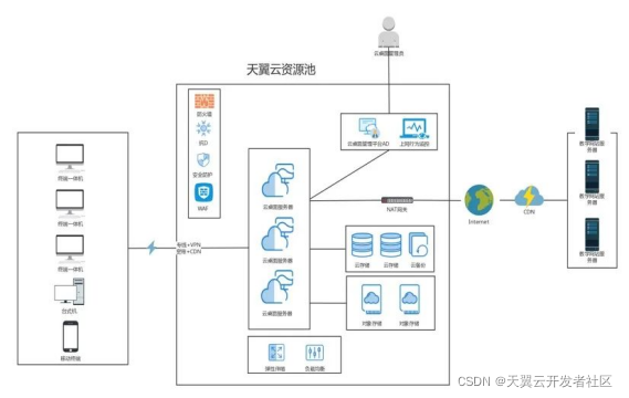 天翼云NAT网关+大带宽方式统一上网入云,节省资源,方便灵活,同时还有专线+VPN方案,保证网络连接安全、稳定