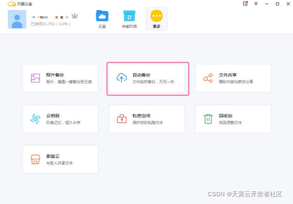 在云主机上安装天翼云盘个人版客户端,登录后点击界面上的“更多“按钮,再点击“自动备份”功能,选择需要备份的目录。