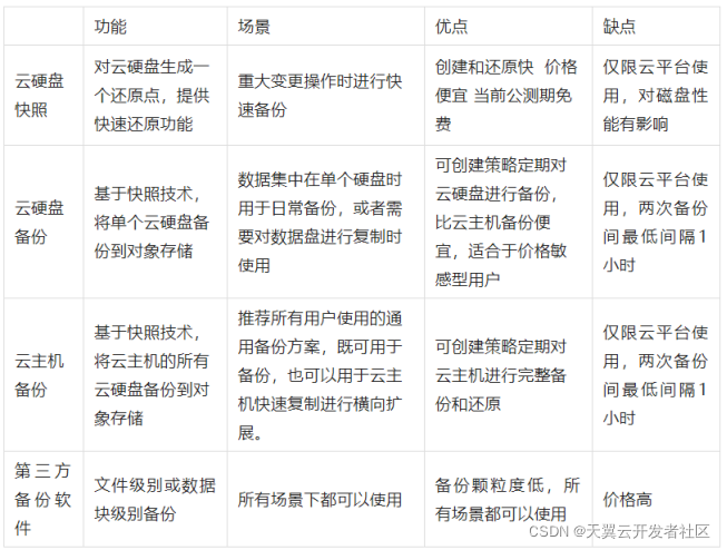 云主机快照、云硬盘备份、云主机备份都是天翼云提供的简单快捷的数据备份方式,只能在云平台上使用。它的缺点是仅限云平台使用,使用策略进行定期备份时间隔最少要相隔一个小时,不能实现连续备份。所以对于数据库等关键系统,建议使用数据库厂商自己的解决方案或者第三方备份软件对数据库做逻辑备份,甚至使用CDP软件实现数据块级别的实时灾备。