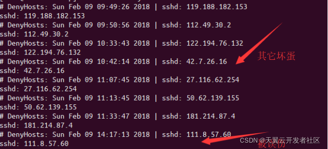 denyhosts 服务就是天翼云为保护Linux云主机、防止恶意暴力破解云主机密码而默认启用的安全策略。默认的策略为允许密码输入错误10次,当第11次失败就会触发安全策略,访问者的公网IP地址会被自动加入到云主机的IP地址黑名单中。IP地址进入黑名单5小时后会自动解封。刚好这个用户由于密码输入多次错误,被云主机误伤。