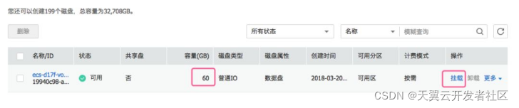 扩容完成后,回到云硬盘菜单,可以看到刚才这个云硬盘的容量已经变为60G。点击挂载按钮,将这个60G的云硬盘挂载回原来的云主机。