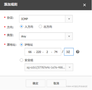 在后续的配置中IPv6隧道服务将使用 66.220.2.74 这个IP地址对云主机进行ICMP探测。如果云主机安全组未开启允许ICMP,需要增加一条规则,允许 66.220.2.74 对云主机的ICMP访问,否则后续的配置将不成功。