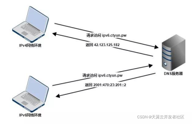 现在我有一个域名是ipv6.ctyun.pw,已经分别配置了A记录和AAAA记录。在IPv4环境下访问 ipv6.ctyun.pw这个域名,DNS服务器将会返回IPv4地址 42.123.125.182;在IPv6环境下访问 ipv6.ctyun.pw 这个域名,DNS服务器将会返回IPv6地址 2001:470:23:201::2