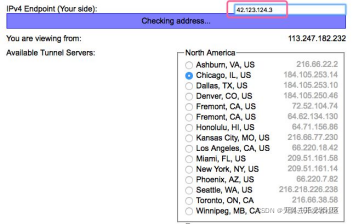 输入云主机的公网IP,选择一个隧道服务器,点击Create tunnel按钮。在本例中我们输入云主机的公网IP 42.123.124.3,并选择使用北美的一台隧道服务器。