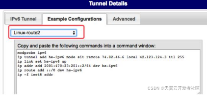 点击Tab页的Example Configurations,下拉菜单选择Linux-route2,页面将显示Linux操作系统的配置命令