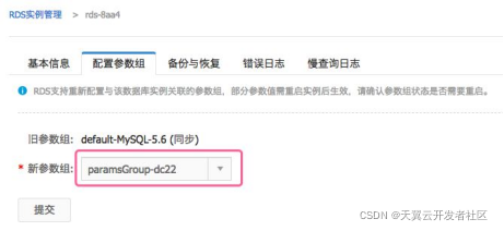 选择到“配置参数组”页面,在“新参数组”下拉中选择第二步创建的参数组,再点击提交。
