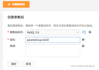 点击页面上方的“创建参数组”按钮,然后选择需要创建的数据库型号及版本。本例中使用的数据库为MySQL 5.6,因此参数组系列要选择 MySQL 5.6。点击确定完成创建。