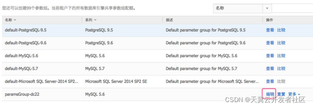 参数组中已经有MySQL、PostgreSQL和SQLServer数据库的默认参数组。默认参数组不能修改,因此我们需要创建一个新的参数组。