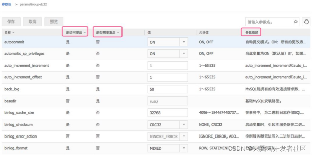 进入编辑模式后,页面已列出该数据库支持的所有参数。页面上“是否可修改栏”栏显示为“是”的参数,表示这个参数可以修改。“是否需要重启”栏显示为“是”的参数,表示这个参数修改后,需要重启RDS数据库才能生效,显示为“否”的参数可以立即生效,不需要重启。同时列表中还对参数的功能有简略的描述。