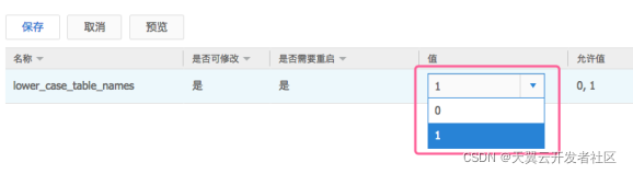 对应到文章开头提到的设置库表大小写不敏感,需要修改lower_case_table_names参数由0改为1。可以在右上角的搜索框中输入lower_case_table_names,快速找到这个参数。点击值这一列,设置lower_case_table_names这个参数为1,然后点击保存按钮使配置生效。