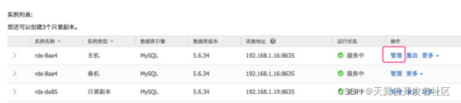 点击进入RDS实例管理,找到正在使用RDS实例。点击主实例行所在的“管理按钮”