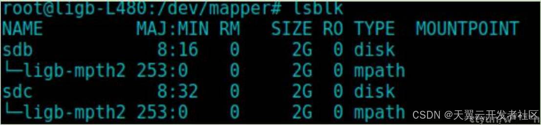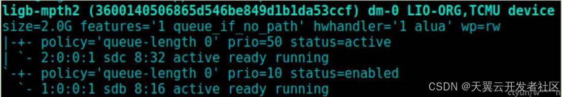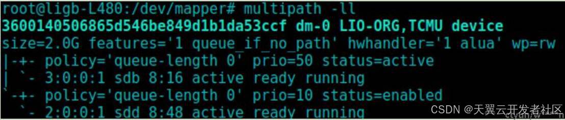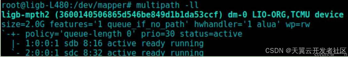 配置成功后,multipath会自动识别路径,若未识别出,可尝试执行 multipath -v3 ,路径识别成功后可以看到两条状态为active ready running的路径,两条路径对应的别名为ligb-mpth2(策略为failover,也即主备)