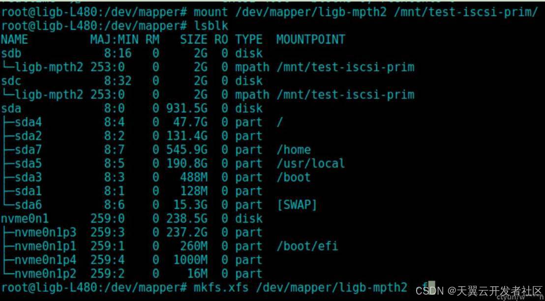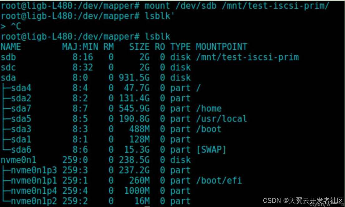 若要使用此iscsi设备,那么需要直接操作ligb-mpth-2这个设备,并且mount后可以发现sdb与sdc都显示了挂载点