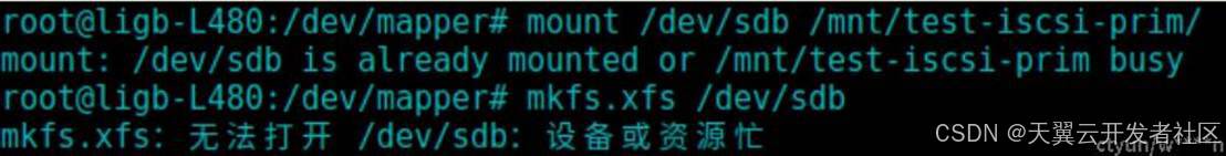 场景:target配置了两个iscsi网关,提供一个2G的块设备;initiator端配置多路径,在/dev下多出两个设备sdb与sdc,并且他们对应的是同一个ligb-mpth2,这两个设备不可以进行格式化与mount.