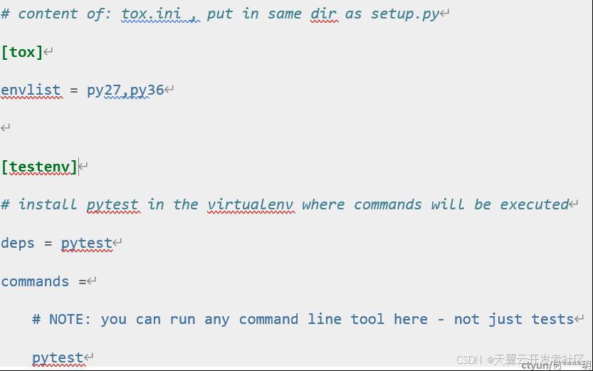 首先,使用pip install tox安装tox。 然后将项目以及测试环境的基本信息放入位于setup.py文件旁边的tox.ini文件中: