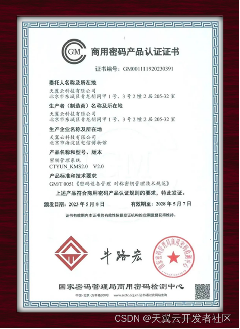 日前,天翼云自研密钥管理系统(KMS)通过国家密码管理局安全性审查,符合GM/T 0051《密码设备管理 对称密钥管理技术规范》要求,获得由国家密码管理局商用密码检测中心颁发的《商用密码产品认证证书》,天翼云也成为业内首-个获得该证书的主流云厂商。