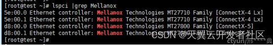 常用的IB网卡厂商有Mellanox,Intel。此处以Mellanox网卡实践,如下图所示test节点上有两块双端口Mellanox网卡,其中MT27800是100GE网卡,MT27710是25GE网卡,且已经工作在RoCE模式或TCP模式